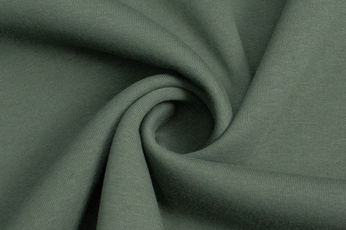 Хорошего качества трикотаж футер в три нити с начёсом – наиболее плотный тип трикотажной ткани, имеющий с изнаночной стороны густой ворс, мягкий начёс, что делает его приятным для человеческого тела Мягчайший, плотный, комфортный и удобный в носке трикотаж будет незаменим в холодное время года в виде байки, свитшота, толстовки, тёплых спортивных брюк, тёплого спортивного костюма, детской одежды, а летом в виде верхней одежды. Ткань бутылочного темно-зеленого цвета позволит создать не только комфортные, но и красивые изделия. Ткань немного тянется в ширину.